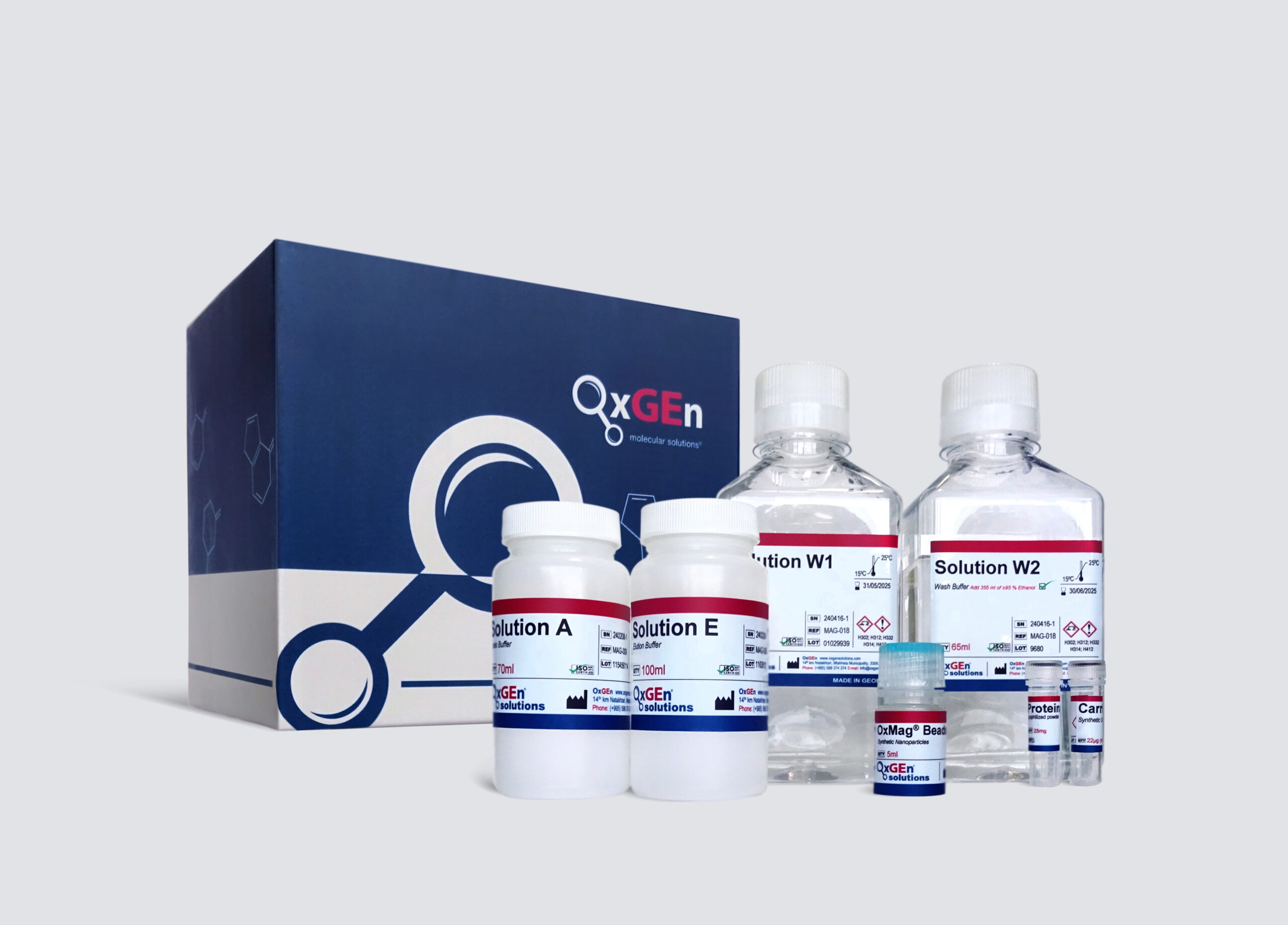 The OxMag DNA Purification Kit uses magnetic bead-based technology for the fast and reproducible recovery of genomic DNA from a variety of liquid and solid biological materials. The kit is general purpose and can process sample types such as blood, buffy coat, saliva, swabs, urine, semen, tissue, and cell culture material. It is optimized for high-throughput use and can be used with leading automated liquid handling platforms, including Tecan Fluent, King Fisher Flex, and others. The streamlined protocol minimizes hands-on time and maximizes DNA yield and quality. Purified DNA is amenable to a broad range of downstream applications, including PCR, qPCR, and sequencing platforms.